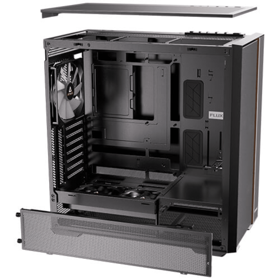 Antec Flux Rear, 5 PWM Fans Included, F-LUX Platform, Front PSU Chamber, Back Connect Motherboard Support, Premium Wood Accents, Tempered Glass, 360mm Top Radiator Support, Mid-tower ATX PC Case – CS – CA-FLUXR1 – ANTEC – 761345102414 – FLUX REAR