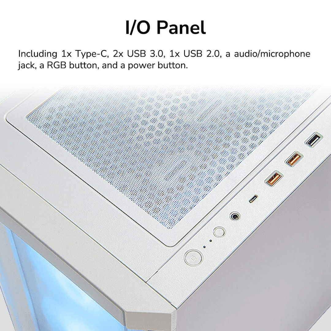 - I/O Panel: Type C Gen 2 (Key A 20-pin connector) x 1, USB 3.0 x 2, USB 2.0 x 1, 4 Pole Headset Audio Jack x 1, RGB Button