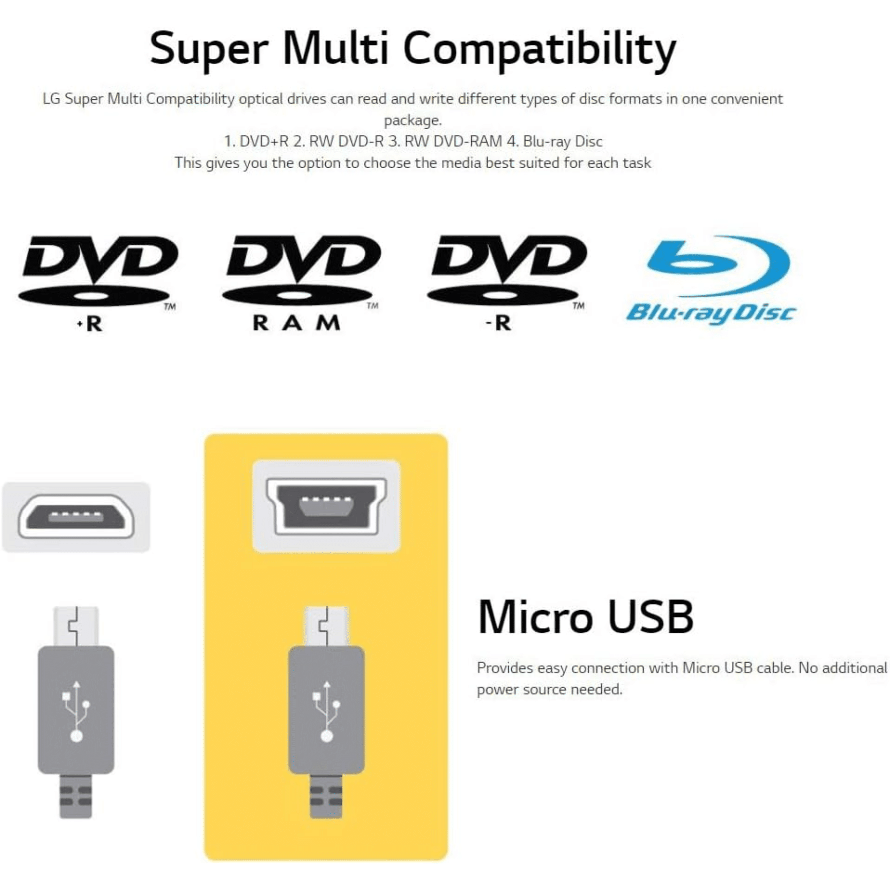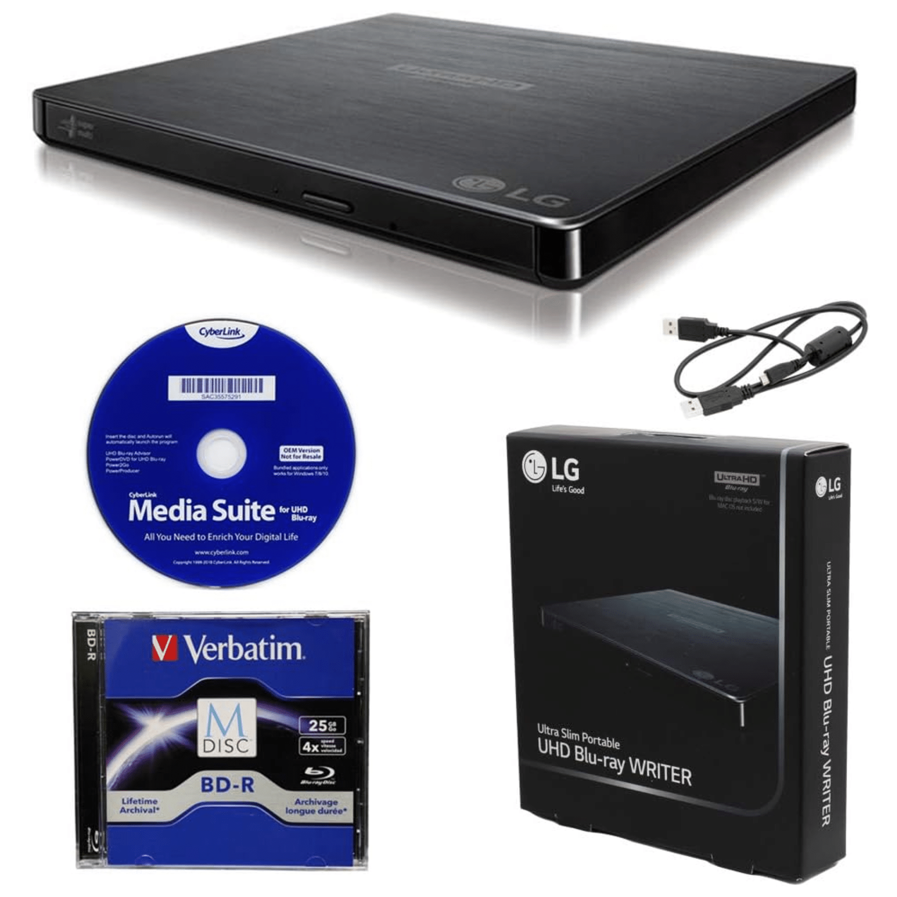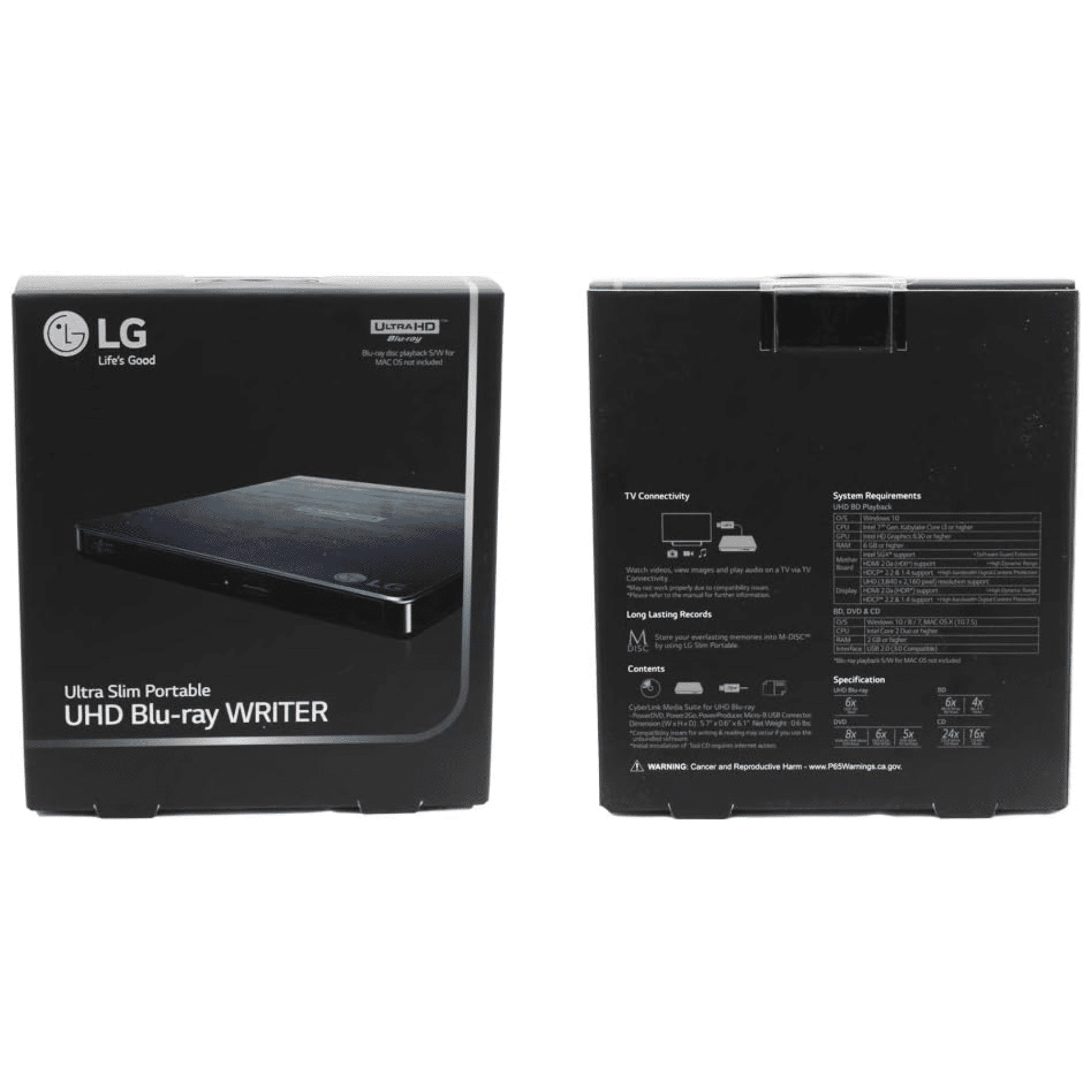 LG Blu-ray/DVD Writer – 24x CD Write/16x CD Rewrite/24x CD Read – 6x BD Write/2x BD Rewrite/6x BD Read – 8x DVD Write/8x DVD Rewrite/8x DVD Read – 4x M-DISC Write – USB 2.0 – SATA