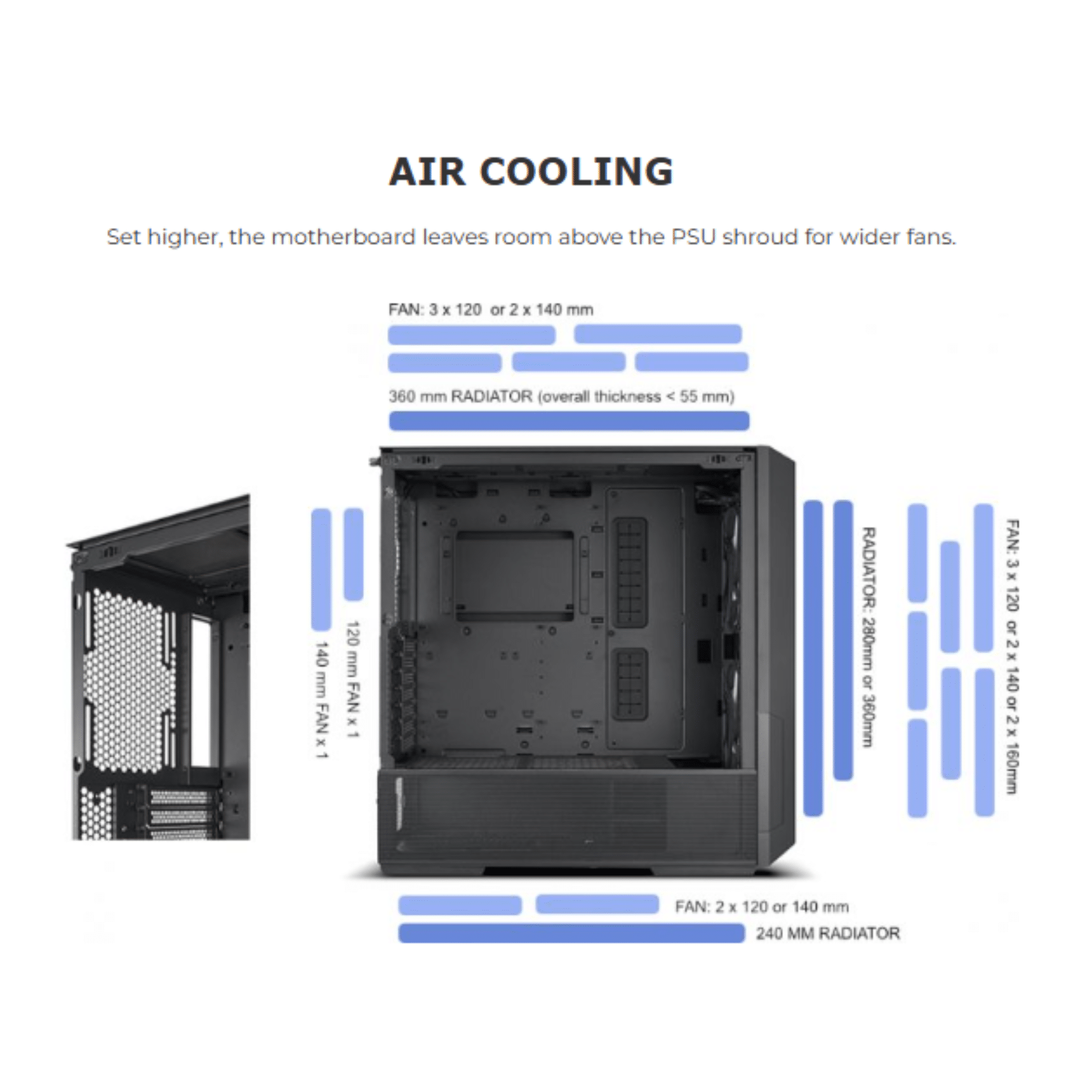 - PSU Cover: 2 x 120mm / 2 x 140mm (Air Cooling mode)