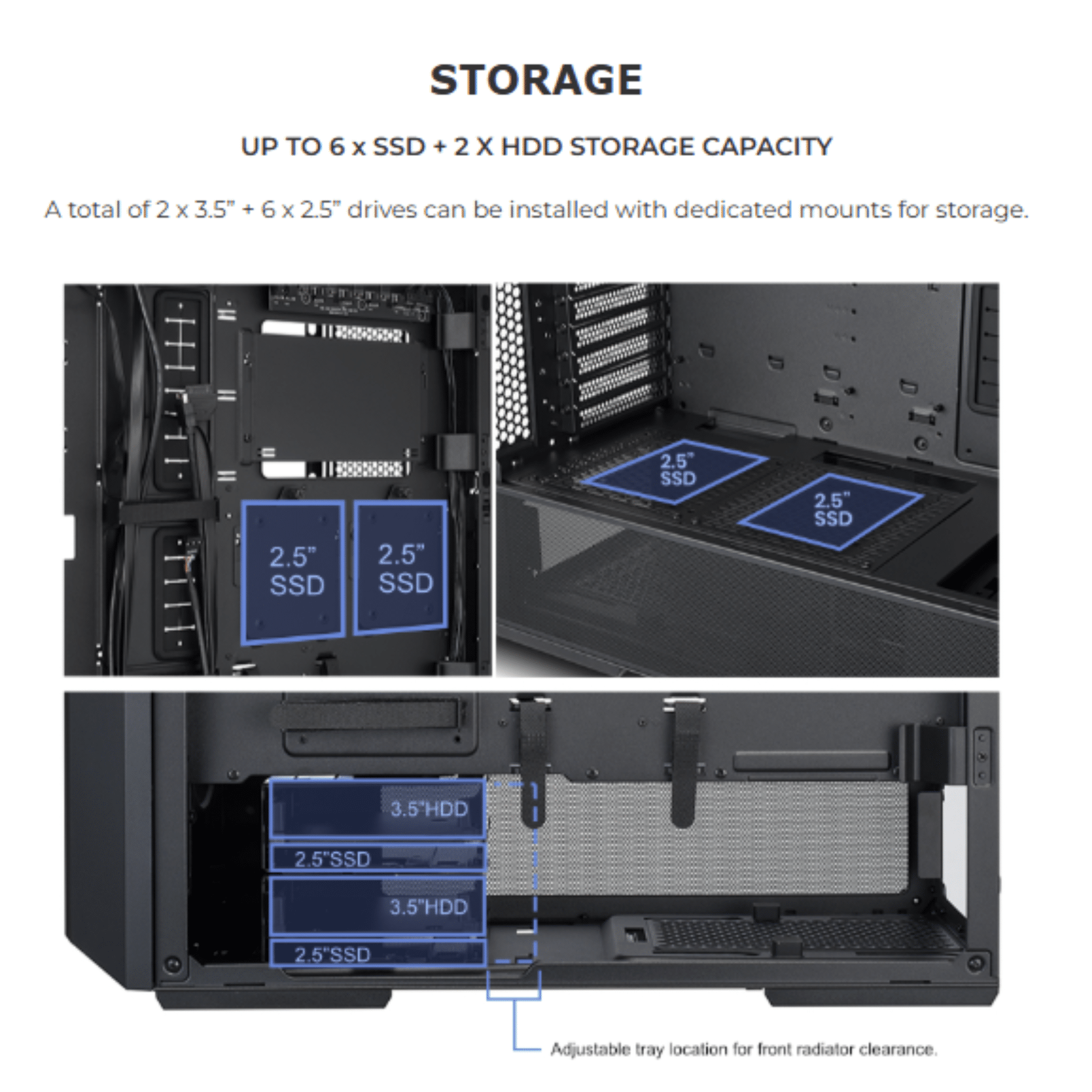 - Drive Cage: 2 x 2.5″ SSD + 2 x 3.5″ HDD