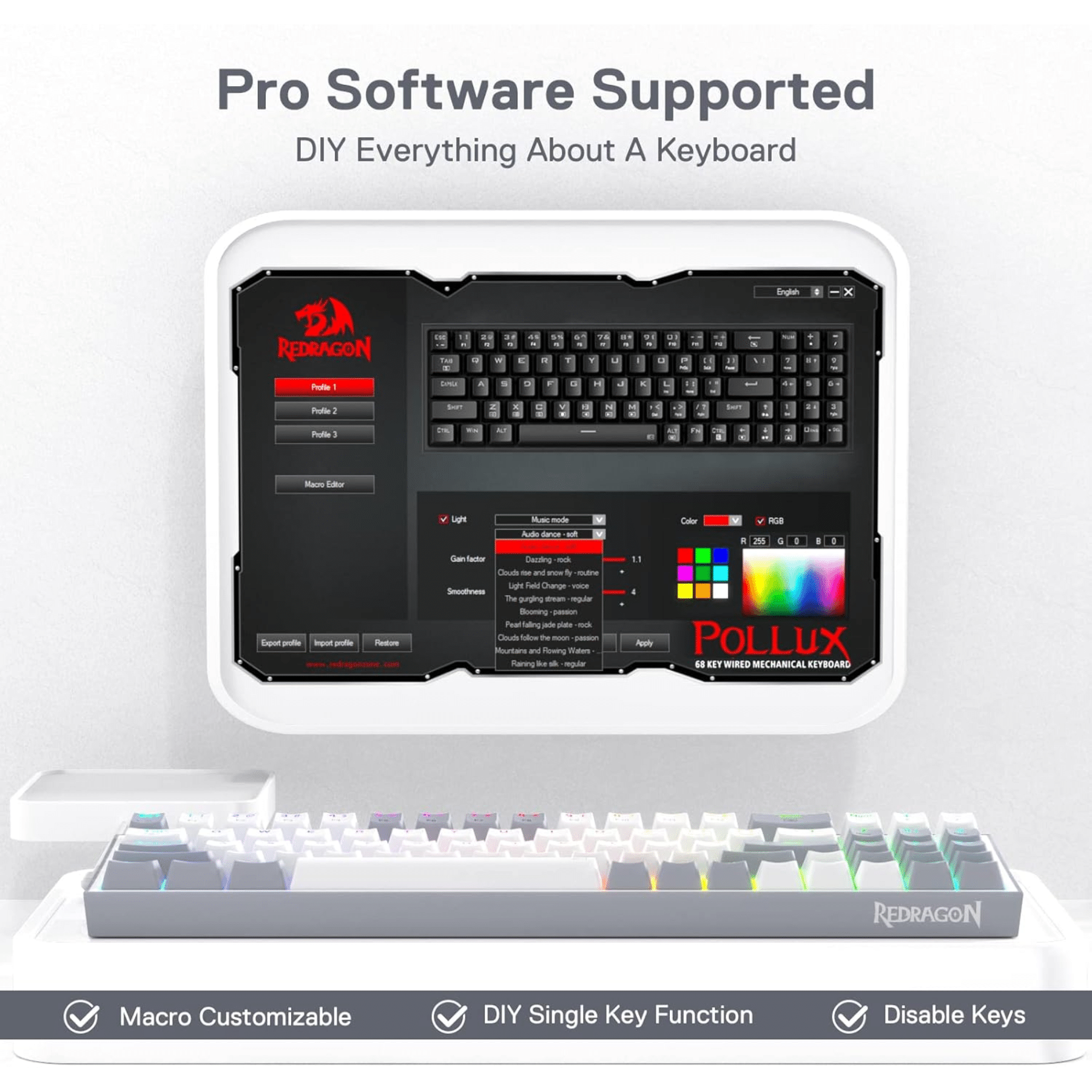 With pro software support, you can expand your options by designing your own new modes and effects. Macros with different keybindings or shortcuts make work and gaming more efficient.