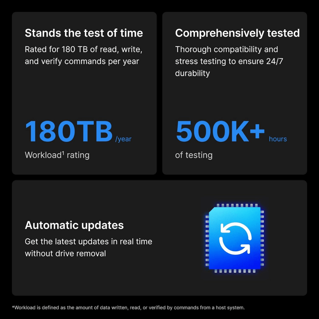 Using 100% conventional magnetic recording (CMR) technology, Plus Series disk drives ensure consistent write performance throughout their lifespans.
