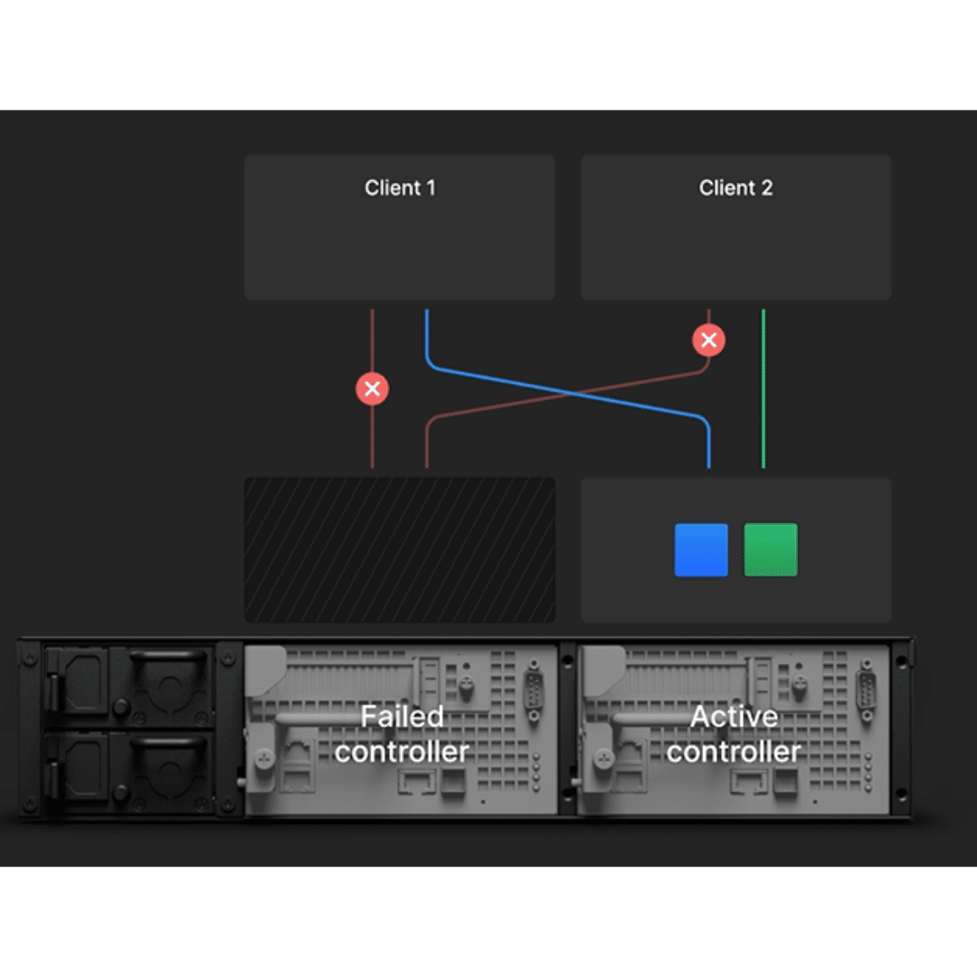 Keep file sharing services, block storage, backups, and other office applications online with automatic minute-level failover. Defend against operational disruptions with two independent and hot-swappable controllers operating in an active-passive configuration.