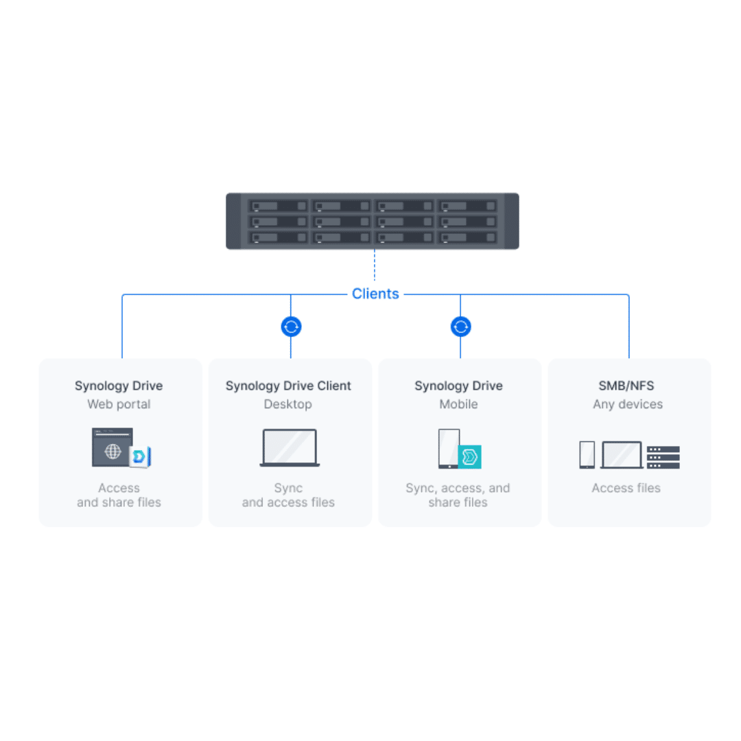 View, edit, and share data through desktop, mobile, and web-based applications. Enable user access to shared folders over SMB or NFS and leverage Microsoft AD or LDAP integration for efficient user access and permissions management.