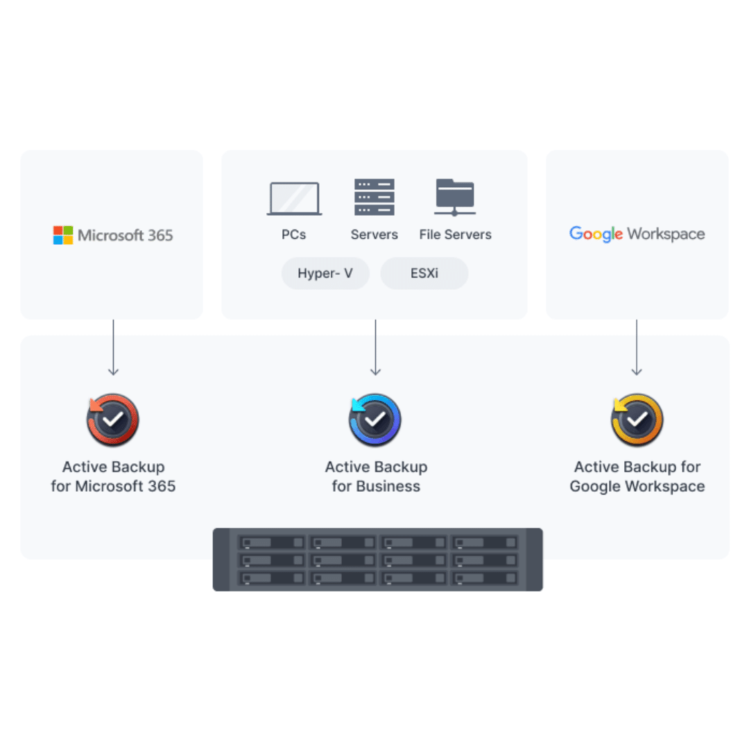 Consolidate and automate backup tasks for PCs, servers, VMs, SaaS applications, and more with Active Backup Suite. Manage all backup tasks from a central console and quickly restore specific files, entire devices, virtual services, and employee SaaS accounts to keep your business running.